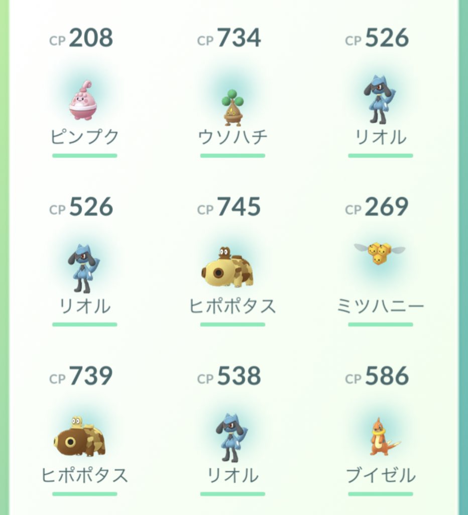 ミツハニー♂、チェリンボ、ドーミラー、スボミー、ミツハニー♀、リオル(ノーマル低個体)、ウソハチ、ヒポポタス、ヒポポタス。